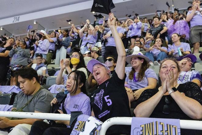 事实证明市场就吃这一套,在球队官宣队名、队徽和球衣颜色之后,女武神队的周边产品就迅速卖遍全美甚至全球。其中象征“庄严、神秘、自信”的紫色尤其受欢迎,2024年,这支空壳球队竟然成了WNBA的销冠,建队完毕之后,在大通中心的前九场比赛门票也全部卖光——整整16万张门票,彻底刷新了美国女篮乃至北美女子职业体育的纪录。