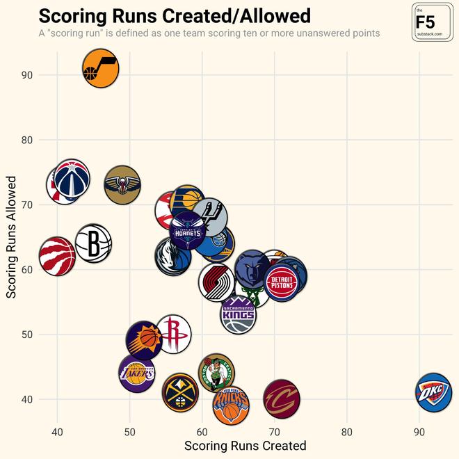 而这,正是雷霆在第三节打出10比0攻击波完成逆转的关键。如图所示,考虑到雷霆是防守效率最好的球队,他们也的确擅长一波流式的高潮,而且可以说是断崖式领先其他所有球队。