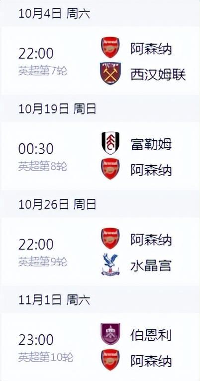 阿森纳将先后在主场迎战西汉姆联,随后客场对阵富勒姆,之后回到主场对阵水晶宫,再连续客场挑战两支升班马伯恩利与桑德兰。