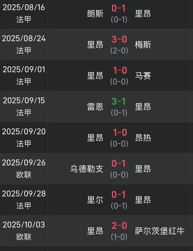 本赛季8场比赛,里昂有7场比赛零封了对手,包括1-0战胜朗斯、3-0大胜梅斯、1-0小胜马赛、1-0战胜昂热、1-0击败乌得勒支、1-0战胜里尔、2-0拿下萨尔斯堡,他们仅在1-3不敌雷恩的比赛中被对手破门,那也是他们本赛季唯一的败局。