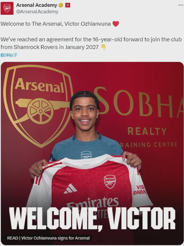 官方:阿森纳宣布和沙姆洛克流浪者就维克托-奥日英超日报安武纳的转会达成了协议,这名16岁的新星将在2027年1月份年满18周岁后正式登陆北伦敦。
