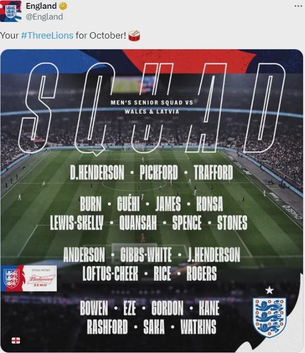 官方:斯凯利、赖斯、埃泽和萨卡入选了最新一期的英格兰大名单。