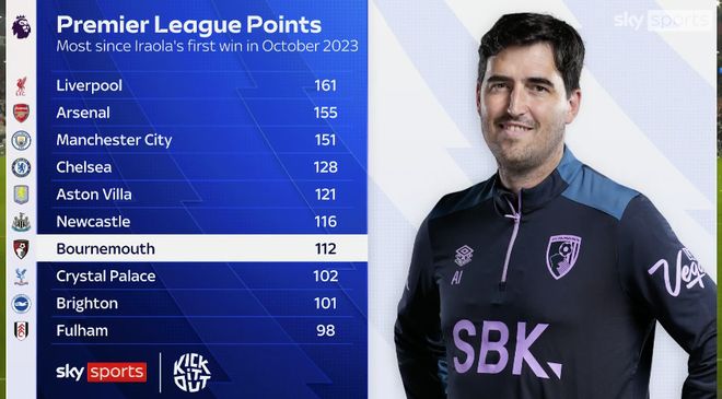 10月4日英超日报讯 据英国天空体育统计的数据显示,自2023年10月份,伯恩茅斯主帅伊劳拉带队取得首胜之后至今,樱桃军团在英超联赛累计取得了112分,位列英超第七,超越曼联、热刺等传统Big6战队。