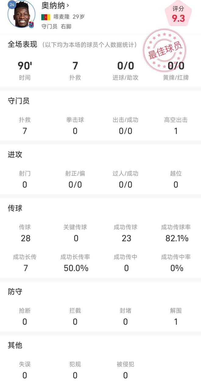 奥纳纳赛后获得了数据网站9.3分的高分,并毫无悬念地将他评为本场最佳球员。